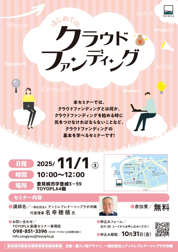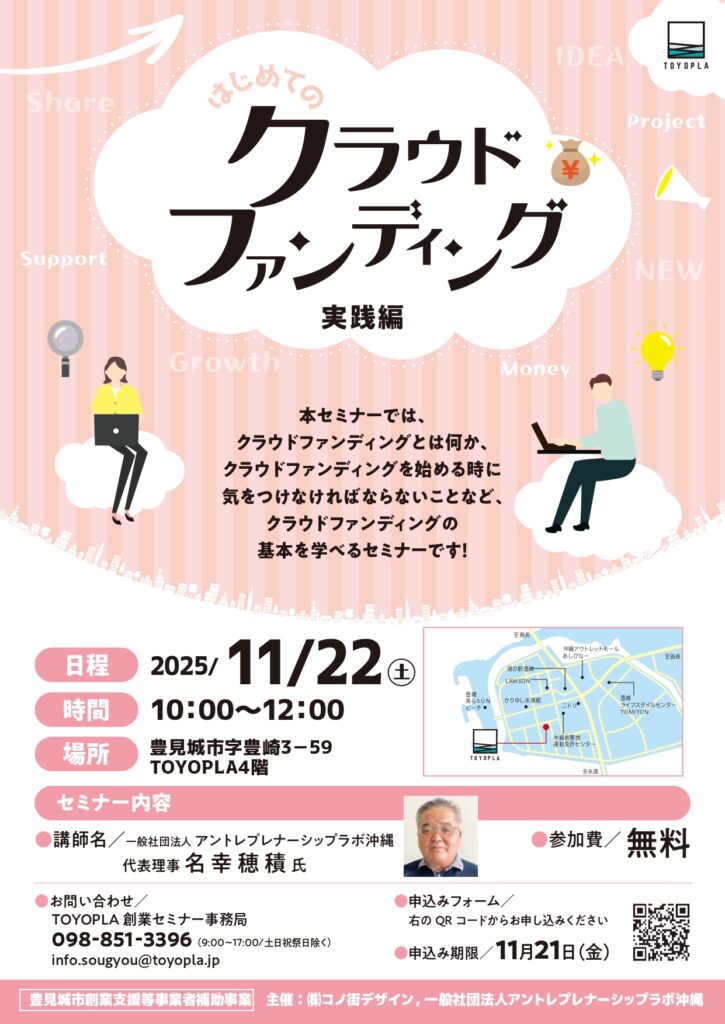 はじめてのクラウドファンディングセミナー 【豊見城市創業支援等事業者補助事業】 クラウドファンディングとは何か、クラウドファンディングを始める時に気をつけなければならないことなど、クラウドファンディングの基本を学べるセミナーの今回は【実践... イベント